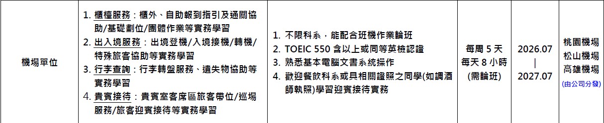 長榮航空2026年實習生進用需求請參閱附檔一、二,全實習期間須符合在校生資格。