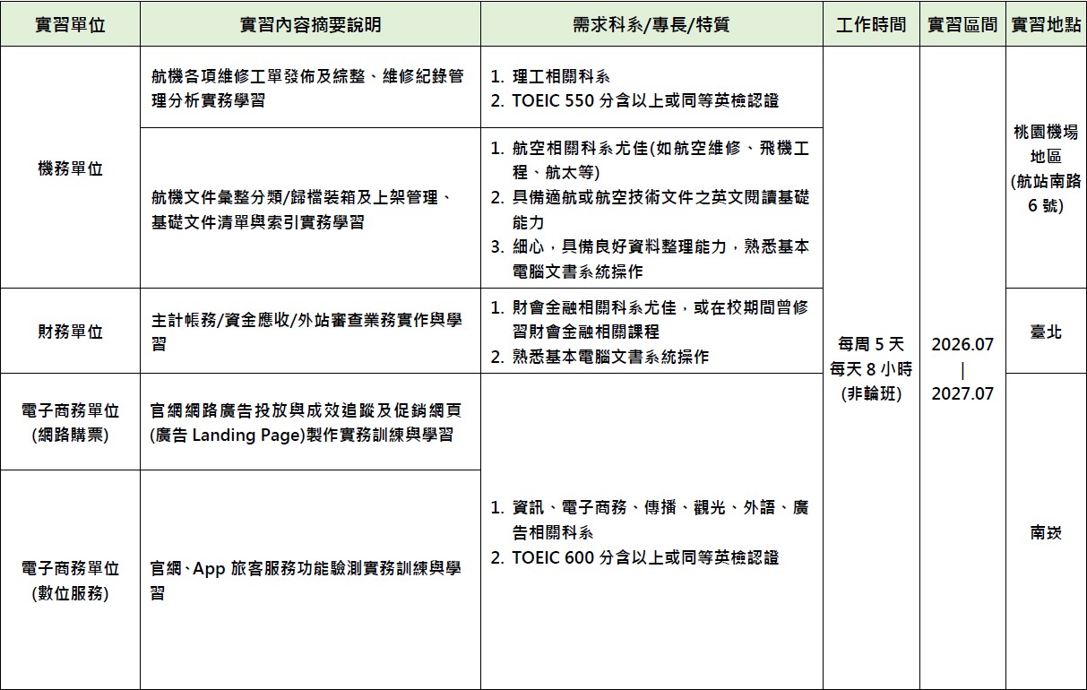 長榮航空2026年實習生二招進用需求請參閱附檔一、二,全實習期間須符合在校生資格。