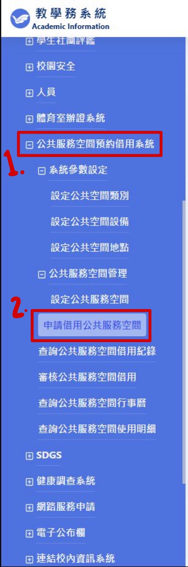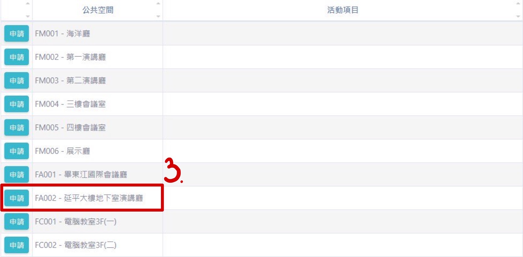 請至【教學務系統】à 公共服務空間預約借用系統 à 申請借用公共服務空間 à 延平大樓地下室演講廳